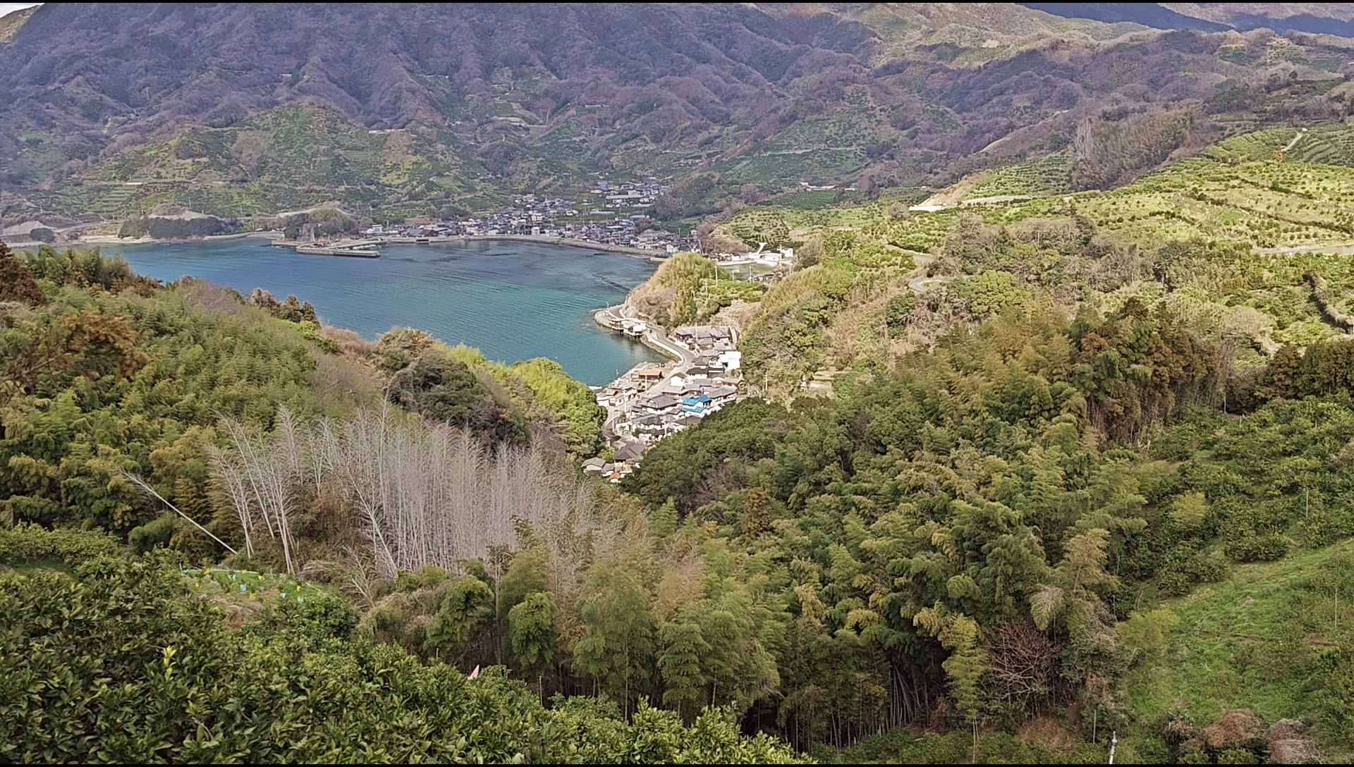 段々畑の広がる山なみと太陽の光を反射して輝く綺麗な海は心洗われる景色です。