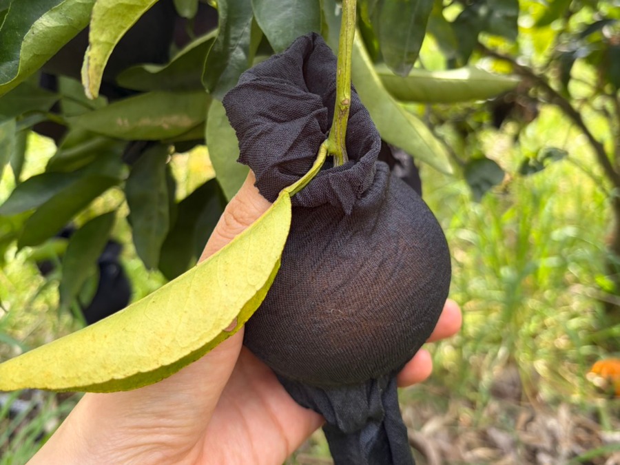 白砂さんは柑橘1つ1つに袋掛けをして育てています。